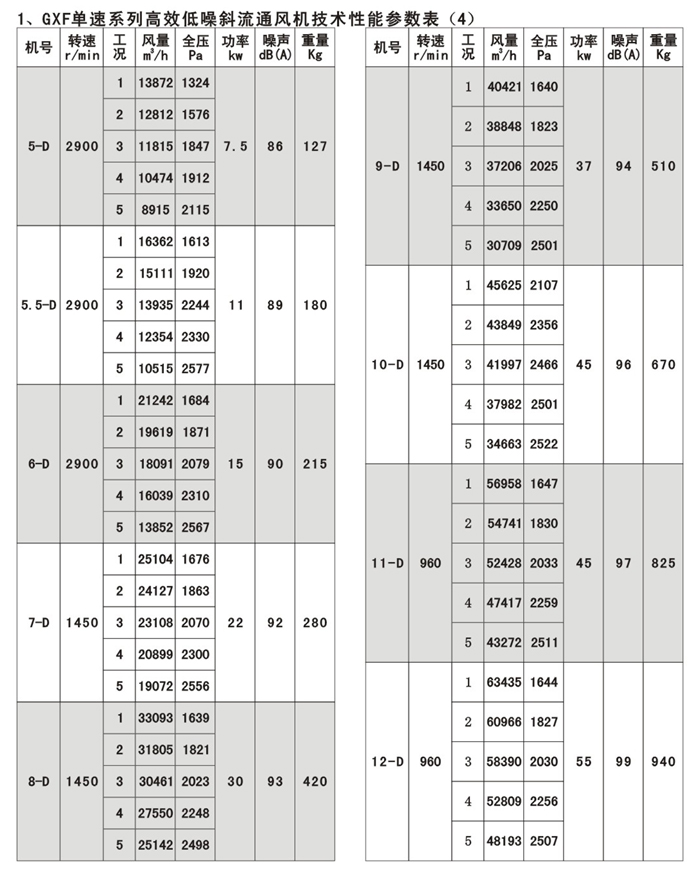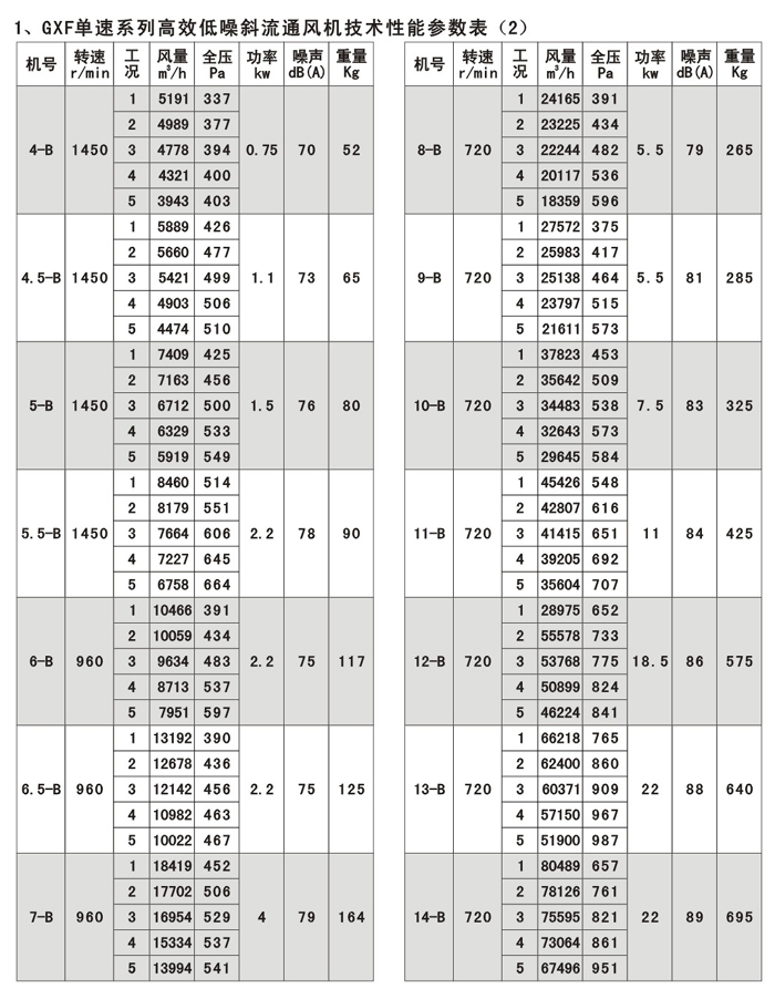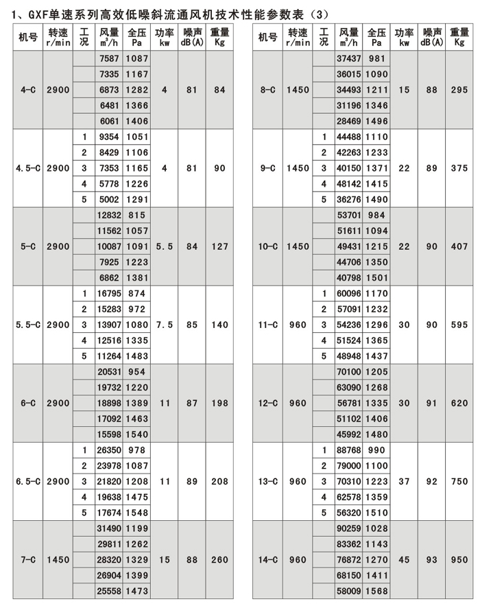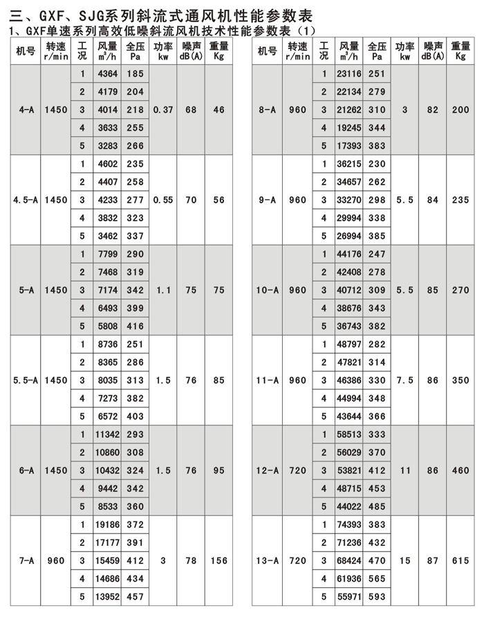 GXF系列斜流通風機按葉輪直徑分為400-1400mm十四規格,按類型分為A、B、C、D、S五種類型,共五十八個機號。風量由3000-90000m3/h,全壓由185-2500Pa;這樣就給設計部門和用戶單位提供了充分的選擇條件,具體數據請查風機性能參數表。