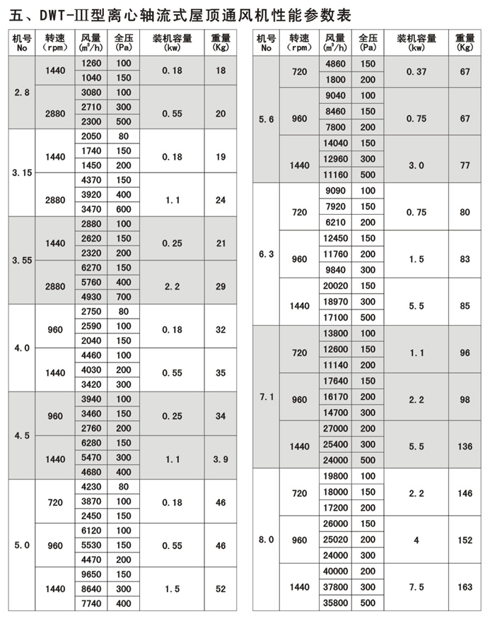 一、特點 1.型式規格多,應用范圍廣:可根據使用場合的風量,風壓和噪聲的不同要求,選用以下型式的風機: 軸流式屋頂通風機:代號為DWT-I型,具有風量大,壓力較離心式風機的特點。同時根據用戶要求還可設計成雙向旋轉可逆式,具有正反式況等效的特點。 2.效率高噪聲低本風機系采用先進的CAD系列軟件,經多目標優化設計開發。本系列風機中1200.1400.1500.1600.2000.及2400mm風機采用同值徑不同轉速,不同角度改變幾量.風壓的方法,以滿足不同使用工況的需要,達到風機與系統匹配,以利實現節能和降低噪聲; 3.質輕。高強。耐腐蝕;風機葉輪可根據工作空氣介質不同的腐蝕性而采用不同的材質,分別有ABS(工程塑料)FRP(玻璃鋼)和鋁合金板材制作,對于壓力要求高,風機轉速較大的離心風機,葉輪表面較特殊的鍍鋅加噴塑耐蝕處理,不僅降低整機重量且有良好的耐腐蝕能力; 4.運轉平穩,壽命長;本風機的轉動慣量小,動平衡精度高,運轉平穩,各項性能指標的工廠內控標準要求均高于風機待業標準,能確保風機長期穩定地運行; 5.適用面廣:本風機可以根據使用要求,制造成防爆型,阻燃型,適用于抗老化,抽送易燃易爆及有腐蝕性氣體的場合; 6.外型美觀:本風機的風帽部件采用玻璃鋼制作,外表采用進口膠衣樹脂膜,曲面過渡柔和,美觀大方,實用性強;也可根據用戶要求制成鋼風帽經鍍鋅噴塑(PVC)處理; 7.使用條件:介質溫度不超過60攝氏度,氣體中不允許含有過量粘性物,含塵量小于100mg/m。對介質溫度高的場合,我廠有高溫風機技術可提供產品使用。 8.本產品經浙江省產品技術監督所檢測合格,檢測項目含阻燃,導電性能,防爆,抗風性能等,由市產品技術監督局監制。二、型號結構說明 1.軸流式屋頂風機直徑自300-2400mm,供十七種機號,離心式屋頂風機有300-1000mm九種機號。還可根據用戶需要提供其它機號的風機; 2.各種型號的風機結構可參閱總裝圖,它由葉輪,風筒,風帽,傳動部件,活頁風門,防鳥網,安全網等部件組成;(以上配置,按用戶要求制作) 3.風機傳動形式:DWT-1型風機直徑<_2200mm采用電機直聯傳動,2200mm以上風機采用皮帶傳動形式,也可根據客戶要求采用減速器傳動形式,活頁風門有重力式,電動式和手動式三種。 4.屋頂風使用范圍廣且數量大,根據用途的需要結構形式繁雜,本廠可按用戶不同的技術要求,進行研制開發,并對外形結構進行改進。![]() ![]() ![]() ![]() ![]() ![]() ![]() ![]() |
